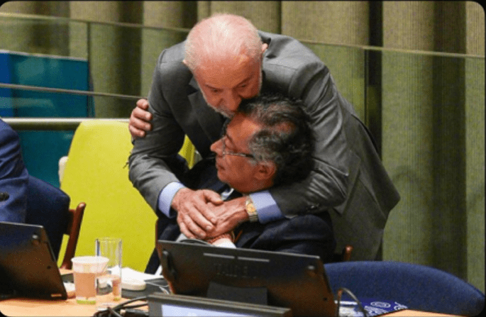 No passar da linha na agulha, olhei o telefone vi essa foto aí em cima — Lula abraçando Petro — e a imagem ficou grudada na minha cabeça. Comecei a pensar em várias coisas ao mesmo tempo.
